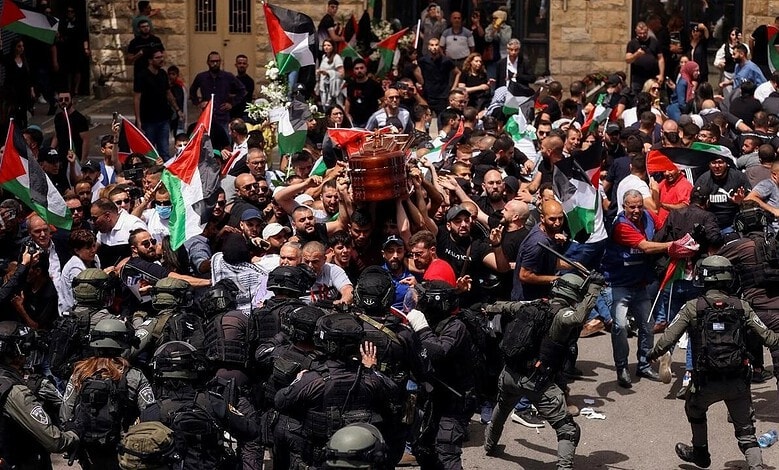 وشارك الآلاف في تشييع مراسلة قناة الجزيرة التي قتلت الأربعاء برصاصة في الرأس خلال تغطيتها عملية لجيش الاحتلال الإسرائيلي في الضفة الغربية المحتلة. وهاجمت الشرطة المشيعين الذين أصروا على حمل النعش والسير به نحو كنيسة الروم الكاثوليك الملكيين ورفعوا العلم الفلسطيني.