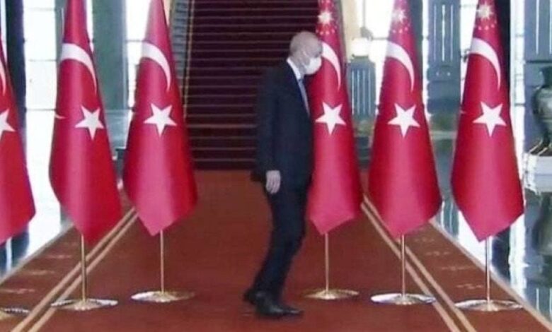 وجاءت تغريدات الناشطين بعد ظهور رئيس النظام التركي في فيديو انتشر بمواقع التواصل ووسائل الإعلام، وهو يمشي بطريقة غريبة، بدا فيها عاجزاً عن متابعة السير إلى درجة أنه كاد يترنح ويقع.