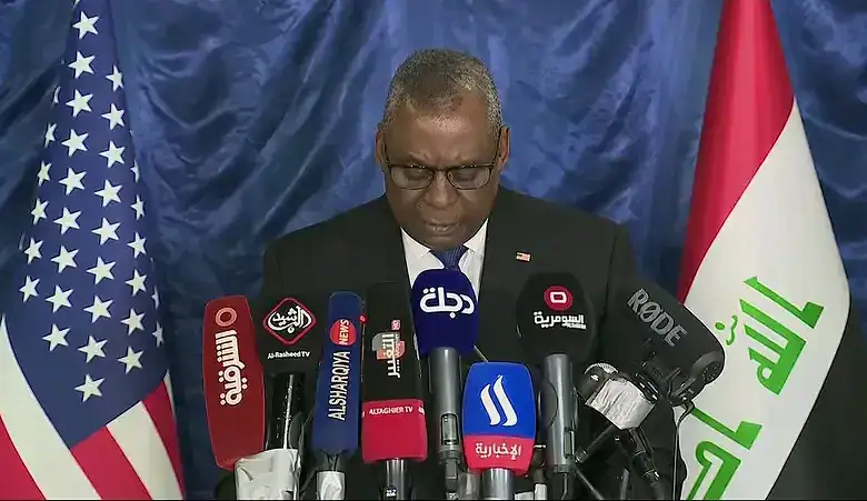 خلال مؤتمر صحافي في بغداد، اليوم الثلاثاء،، أعلن وزير الدفاع الأميركي لويد أوستن، أن القوات الأميركية موجودة في العراق بطلب من الحكومة العراقية، مشيراً إلى أنها تقدم النصيحة والدعم.