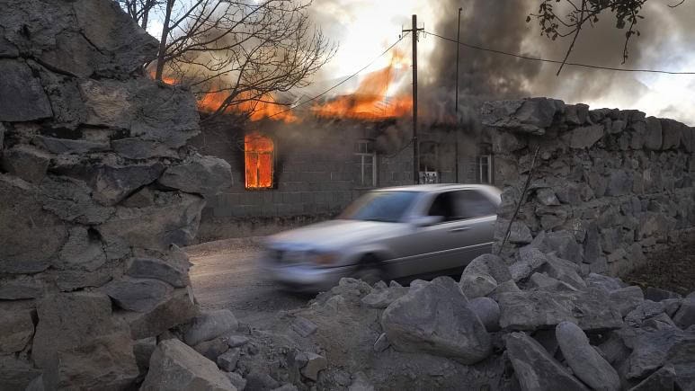أشعل سكان قرى في إقليم ناغورنو كارباخ كانت تحت السيطرة الأرمن النيران في بيوتهم قبل فرارهم نحو أرمينيا، وذلك عشية تسلميها لأذربيجان بموجب اتفاق وقف إطلاق النار بين يريفان وباكو الموقع في موسكو في 10 نوفمبر/تشرين الثاني والذي يعيد لأذربيجان مناطق شاسعة كانت تحت السيطرة الأرمن منذ مطلع تسعينيات القرن الماضي.