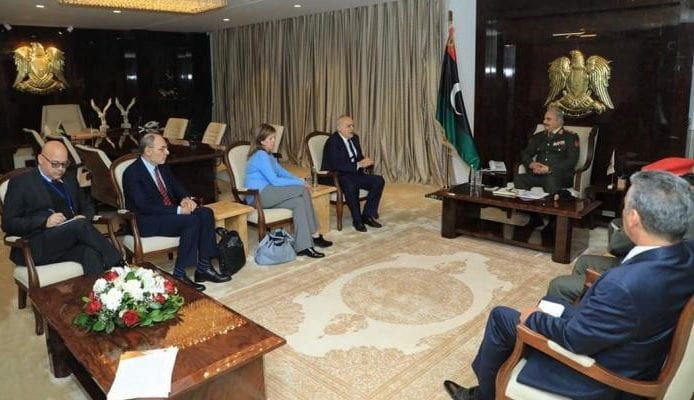 وأشارت البعثة إلى أن المبعوث الأممي لليبيا، غسان سلامة، ونائبته للشؤون السياسية ستيفاني وليامز قد التقيا، السبت، المشير خليفة حفتر القائد العام للجيش الليبي، بمقر القيادة العامة للجيش الليبي في الرجمة بمدينة بنغازي (شرق)، لبحث الأزمة الليبية.