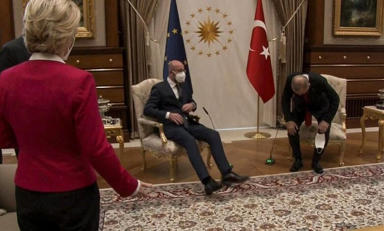 ووقعت “الأزمة البروتوكولية”، بعد أن جلس رئيس المجلس الأوروبي شارل ميشيل والرئيس التركي على كرسيين يتوسطان القاعة، فتمتمت رئيسة المفوضية الأوروبية أورسولا فون دير لاين، وبدت ذاهلة، وظهرت لا تعرف أين تجلس.