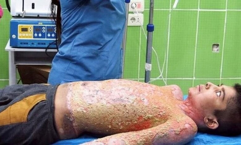 وظهر الطفل الكردي محمد حميد، والبالغ من العمر 13 عاماً، وهو يتألم ويصرخ منادياً على أبويه، فيما تغطي حروق الفوسفور الأبيض كامل جسمه الذي تبرقع بألوان الاحتراق الشديد. وكان الطفل ذاته، مصدوما مما حل، بسبب امتداد الحروق الشديدة على كامل جسمه، وكان عاجزاً من تحريك ذراعيه، وهو ينادي على أمه: “ماما، ماما، مؤلم” ومناديا على أبيه: “بابا، بابا، احترقتُ. مؤلم جداً” بصراخ مذعور شديد التألم والذهول والانصعاق.