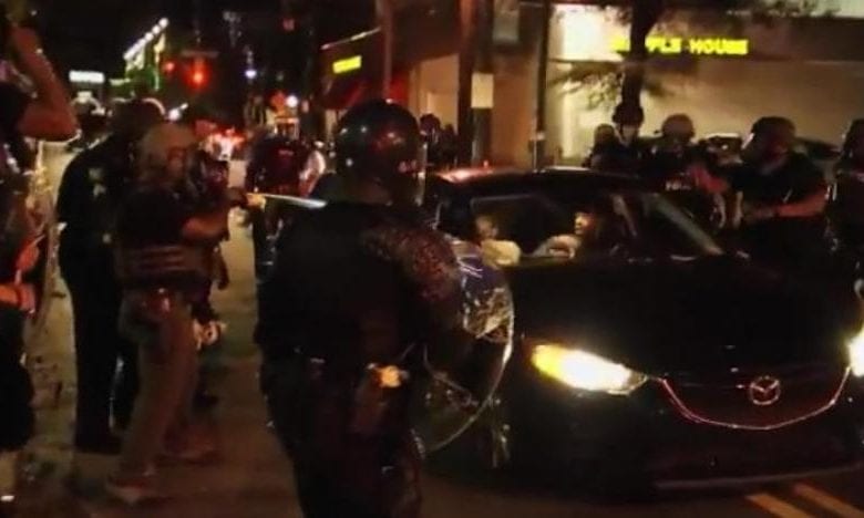In the TV video of the confrontation, the car passenger, identified by friends on social media as Spelman College student Taniya Pilgrim, can be seen with her hands in the air and her door open. She states at least twice that she will get out of the car as police smash the vehicle’s windows.