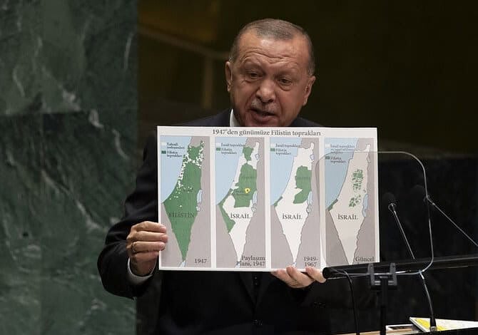 On Israel, Erdogan displayed several boards showing how the country enlarged its territory to the detriment of Palestine and Syria in 1948, 1967, and now with Prime Minister Benjamin Netanyahu’s stated intention to annex large parts of the West Bank. Netanyahu responded: “He who slaughters the Kurds and denies Armenian genocide should not preach to Israel.”