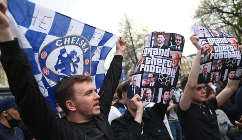 Around 1,000 fans gathered outside Chelsea’s Stamford Bridge ground before their game against Brighton on Tuesday to protest at their club’s involvement.