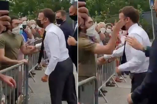 Macron just managed to turn his face away as the attacker’s right hand connected, making it seem that he struck more a glancing blow than a direct slap.