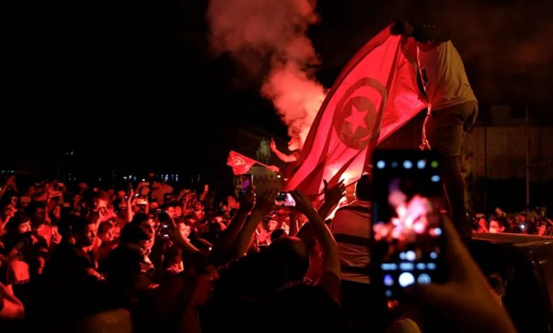 People celebrate in the street after Tunisian President Kais Saied announced the dissolution of parliament and Prime Minister Hichem Mechichi’s government in Tunis on July 25, 2021, after a day of nationwide protest.