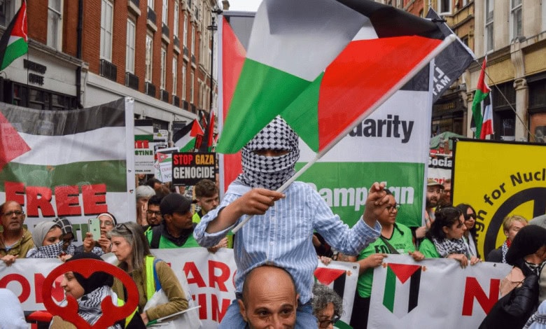 The demonstration was called in response to an Israeli strike which ignited an inferno in a displacement camp outside Rafah, killing 45 people according to Palestinian officials.