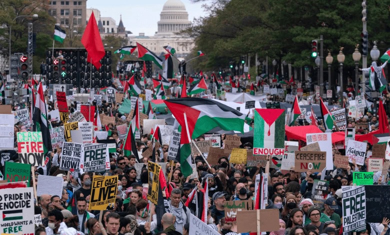Les manifestations se sont déroulées sous le slogan: Nous tous pour arrêter le génocide à Gaza, au cours desquelles des drapeaux palestiniens et des keffiehs ont été hissés.