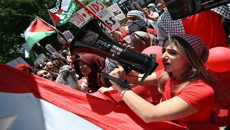 Biden, nous sommes votre ligne rouge, ont déclaré les manifestants, exhortant le président à mettre fin au génocide dans l’enclave assiégée. Ils ont également exigé la suspension de livraison d’armes à Israël.