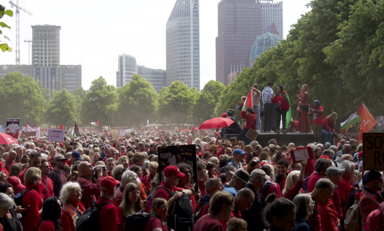 Nearly 100,000 rally the country’s largest protest in 20 years, demanding Dutch government end silence on Israeli attacks