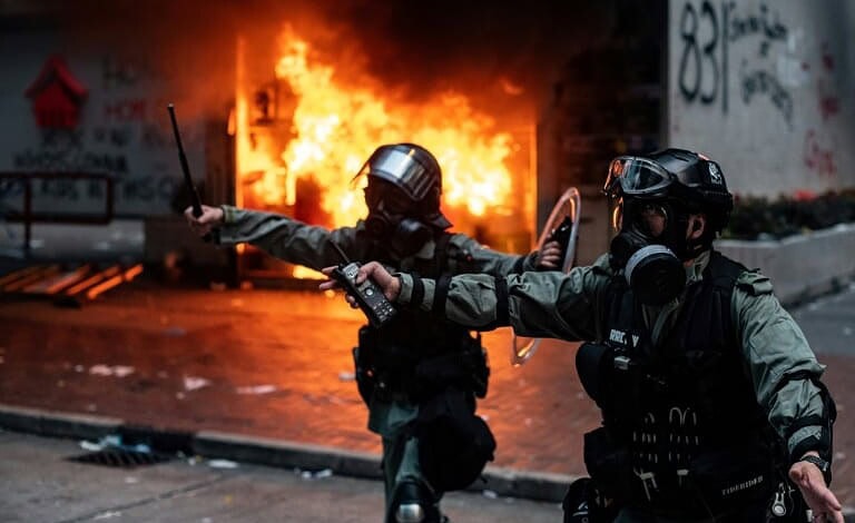 Fierce clashes broke out between protesters and riot police in Hong Kong on Sunday as thousands marched through the strife-torn city, during a day of global protests aimed at casting a shadow over communist China’s upcoming 70th birthday.