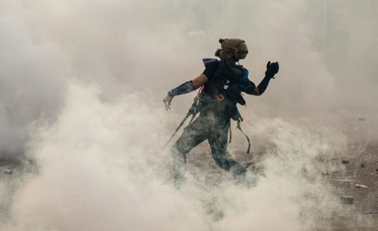 As a tear gas canister clatters onto a street in Hong Kong, a pro-democracy protester wearing heat-proof gloves and carrying a traffic cone sprints from the crowd to put it out.