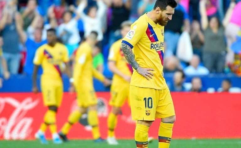Lionel Messi converted a first-half penalty at the City of Valencia Stadium for his sixth goal in five games only for Levante to stun the defending champions with an incredible treble shortly after the hour.