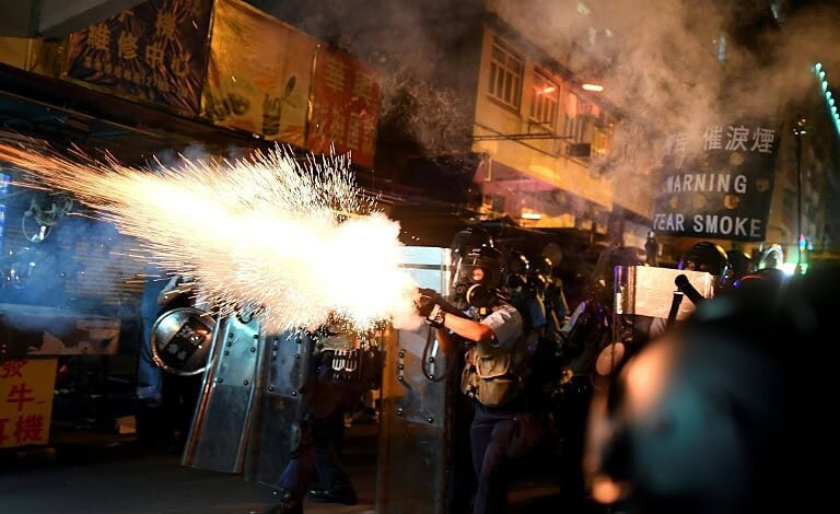AFP / Manan VATSYAYANAPro-democracy protestors pour water on tear-gas shells fired by police in the Sham Shui Po area of Hong KongOn Tuesday, chaos erupted at one of the world’s busiest transport hubs as protesters physically stopped travellers from boarding flights, battled riot police and assaulted two men they accused of being Chinese infiltrators.